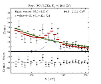 But now just in the past 2 weeks we have an independent author who has examined the publicly available Fermi data for gamma rays emitted from our own Galactic center. He was able to analyze around 3.5 years of data, more than the 2 years’ worth of dwarf galaxy data analyzed. It’s just a little bump in the spectrum (see the central region of the figure below), but he claims to see a positive signal at 130 GeV and with a (marginal) statistical significance just in excess of 3 standard deviations. This is tantalizing, potentially, but not strong enough for a clear detection.