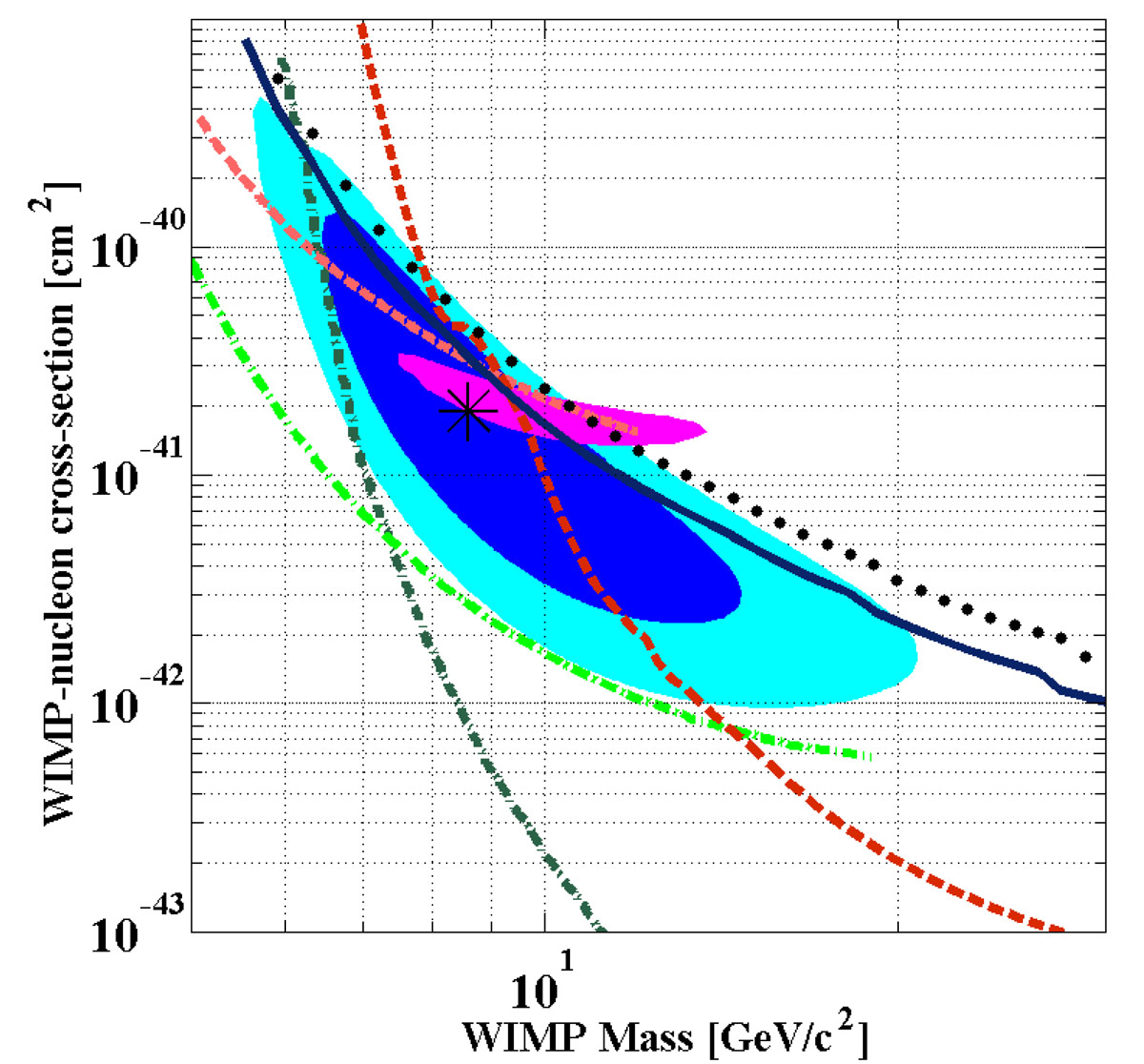 However, this is quite interesting as the error ellipse for the mass and interaction cross-section from this CDMS-II putative result overlaps well with the (smaller) error ellipse of the CoGeNT results. The CoGeNT experiment is a germanium detector run by a different consortium, but based in the same Soudan Underground Laboratory as the CDMS-II experiment! COGENT sees a possible signal with around 2.8 sigma significance as an annual modulated WIMP wind, with the modulation in the signal due to the Earth’s motion around the Sun and thus relative to the galactic center. The purple colored region in the figure is the CoGeNT 90% confidence error ellipse, and it includes the CDMS-II best fit point and suggests also a mass of roughly 10 GeV/c².