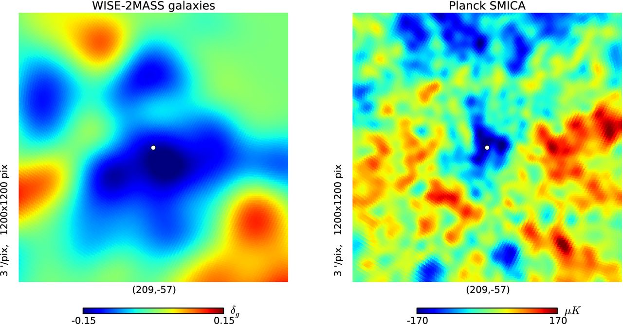 I. Szapudi et al, 2015 M.N.R.A.S., Volume 450, Issue 1, p. 288, “Detection of a supervoid aligned with the cold spot of the cosmic microwave background” – http://mnras.oxfordjournals.org/content/450/1/288.full