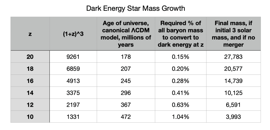Table 1. The first column has the redshift (epoch) of dark energy star formation. In actuality it will happen over a broad range of redshifts, but the earliest stars and galaxies seem to have formed from around 200 to 500 million years after the Big Bang started. The second column has the mass expansion factor (1+z)3; the DE star’s gravitational mass grows by that factor from the formation z until now. The third column is the age of the universe at DE star formation. The fourth column tells us what fraction of all baryons need to be incorporated into dark energy cores in those stars (they could be somewhat more massive than that). The fifth column is the lower bound on their current mass if they never experience a merger or accretion of other matter. All in all it looks as if less than 1% of baryons convert to dark energy cores.