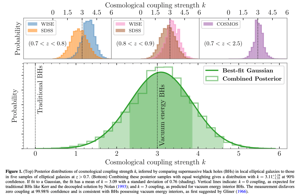 They have used observations of a large number of supermassive black holes and their companion galaxies out to redshift 2.5 (when the universe was less than 3 billion years of age) to argue that there is observable cosmologicalcouplingbetween the cosmological gravitational field at large and the SMBH masses, where they suppose those masses are dominated by dark energy cores.