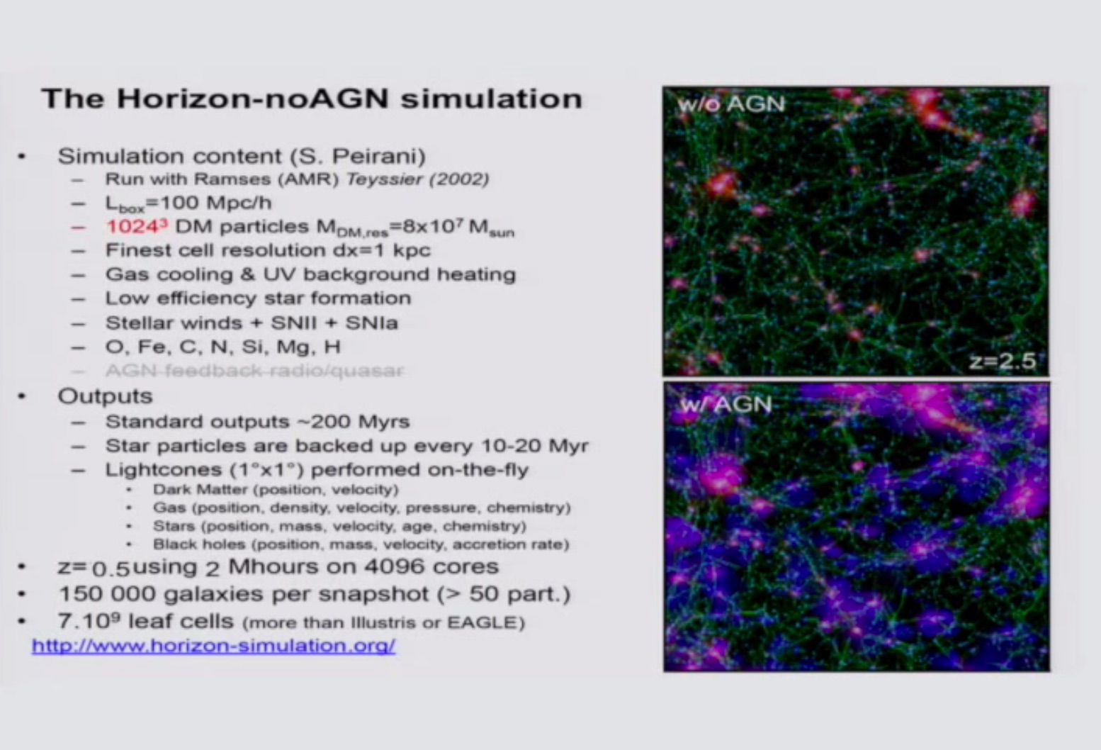 The Horizon simulation had 7 billion grid cells and 1 billion dark matter particles. The highest resolution is down to 1 kiloparsec. Gas cooling, star formation, stellar winds, two types of supernovae are included and the abundances of C, N, O, Si, Mg, and Fe tracked. Black hole formation was included. Two million CPU core hours were required for the simulation.